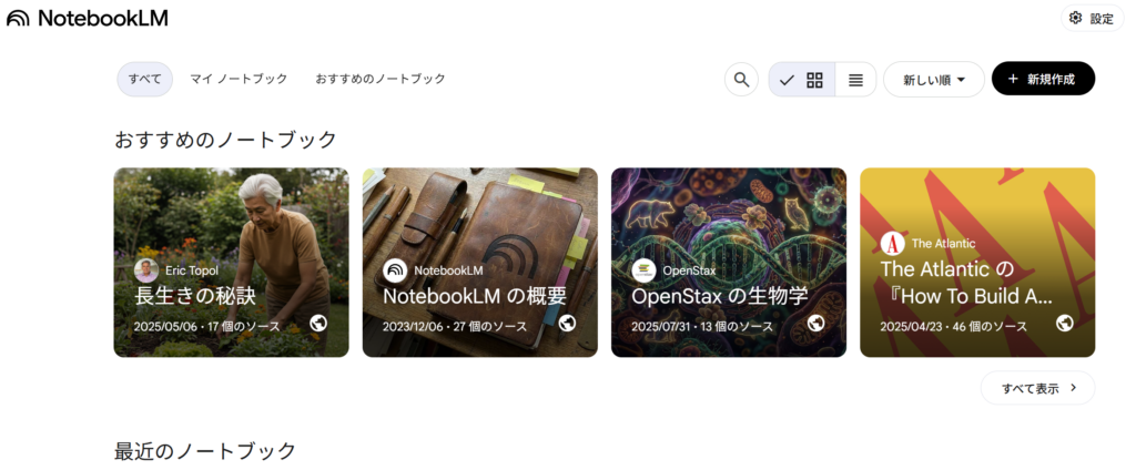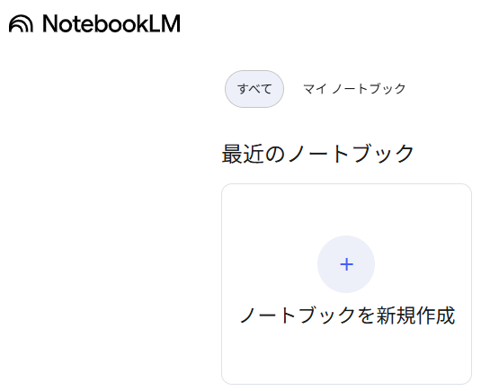 資料が用意出来たら、NotebookLMを開き、「ノートブックを新規作成」をクリックします。