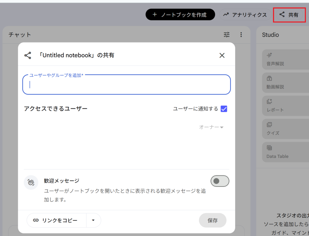 企業で有料のGoogle Workspaceを利用している場合、NotebookLMは管理者の設定により共有権限が制御できるようになっています。そのため、有料のGoogle Workspaceでは、共有機能を使う際に管理者が権限を付与している人しか閲覧できないようになっています。