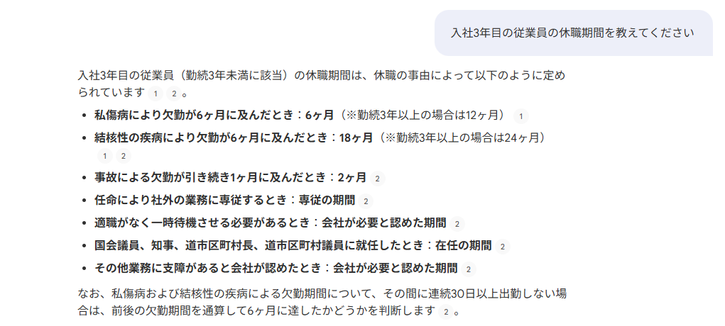 例えば「入社3年目の従業員の休職期間を教えてください」と入力すると、自社の就業規則に沿った回答がNotebookLMから出力されます。