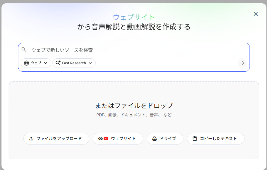 NotebookLMは、ユーザーがアップロードした特定の資料(PDF、Googleドキュメント、テキストファイル等)を知識源として扱います。