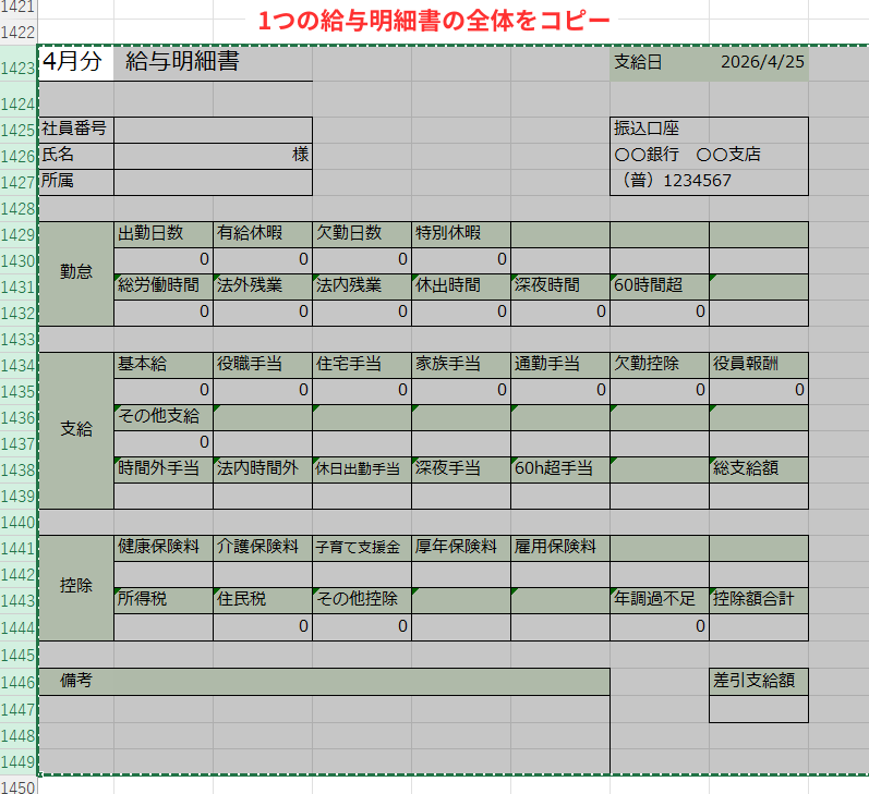 まずは、1つの給与明細書(賞与明細書)をコピーします。