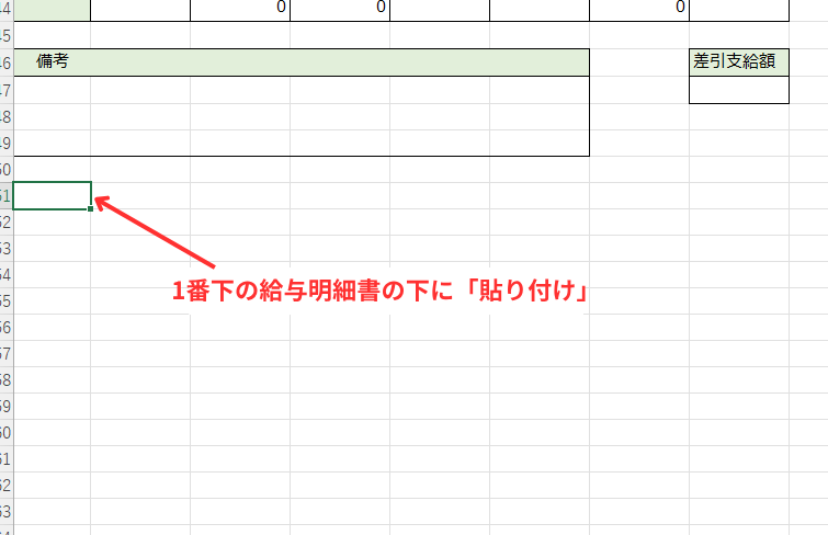 1番下の給与明細書(賞与明細書)の下にあるセル(空欄の場所)にコピーした給与明細書を貼り付けます。
