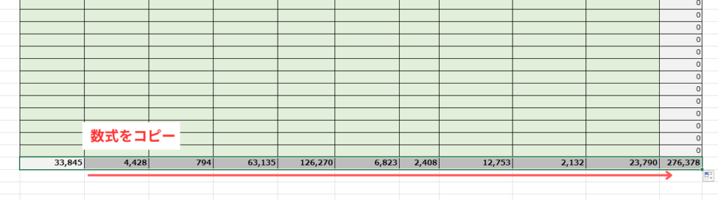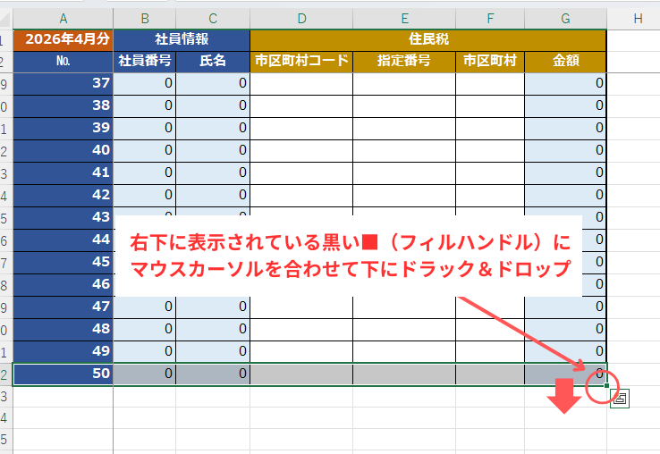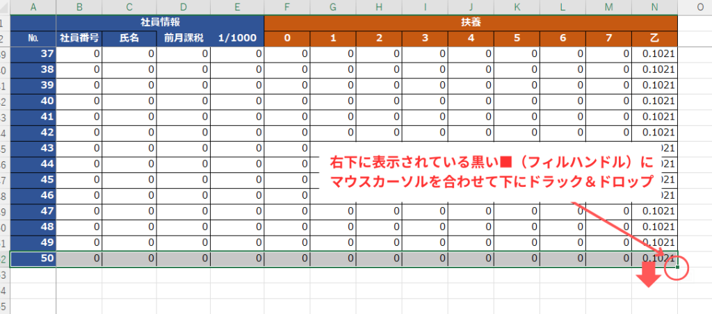 最終行の数式をコピーする必要があるため、下記の図のように最終行をすべて範囲指定し、右下に表示されている黒い四角(フィルハンドル)にマウスカーソルを合わせてドラッグ&ドロップします。