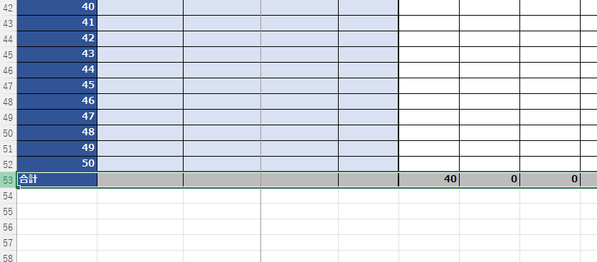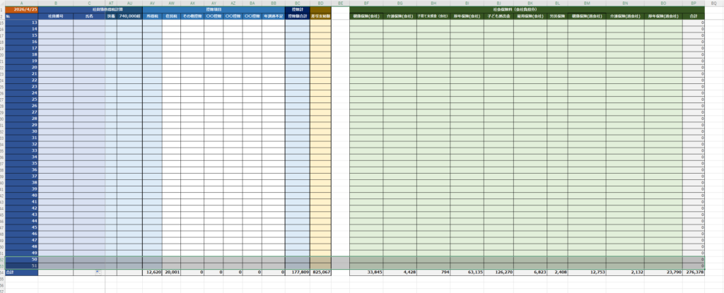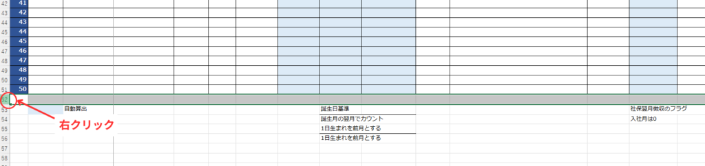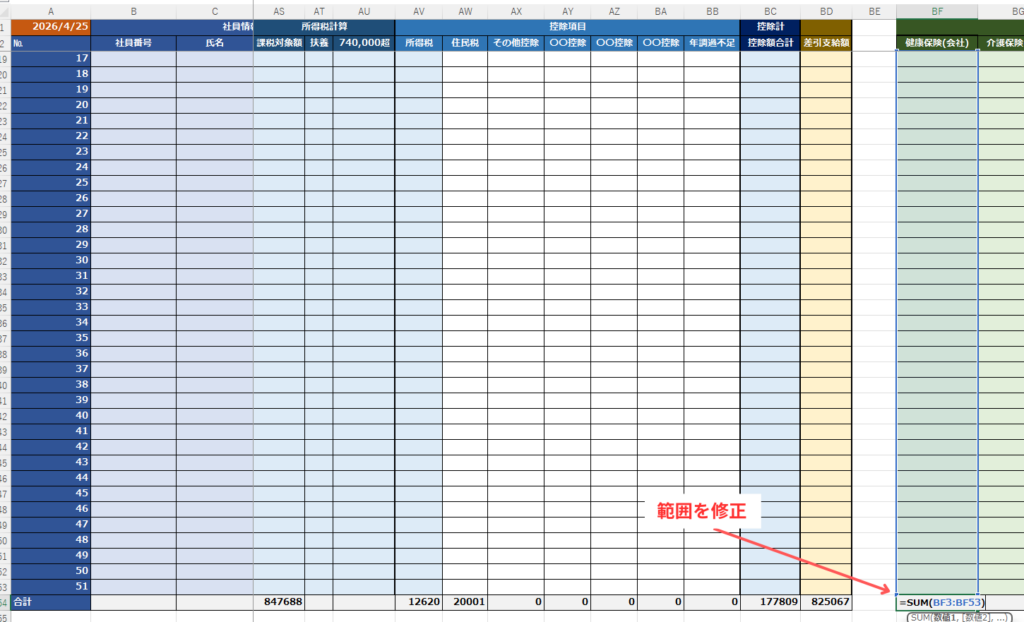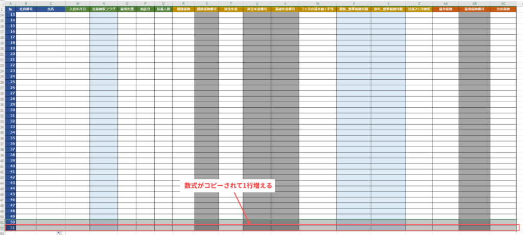 例えば、給与計算シートの53行目に追加した場合は上記の式を「52」から「53」に変更します。