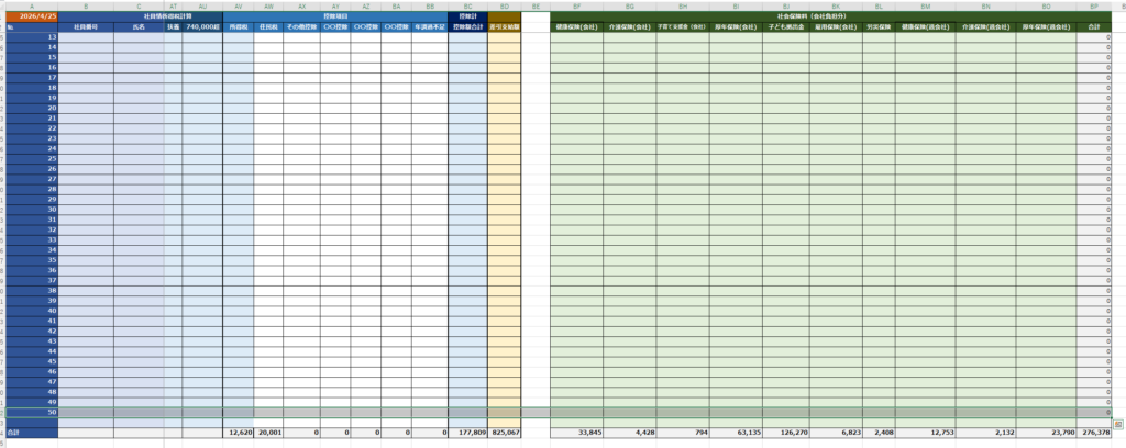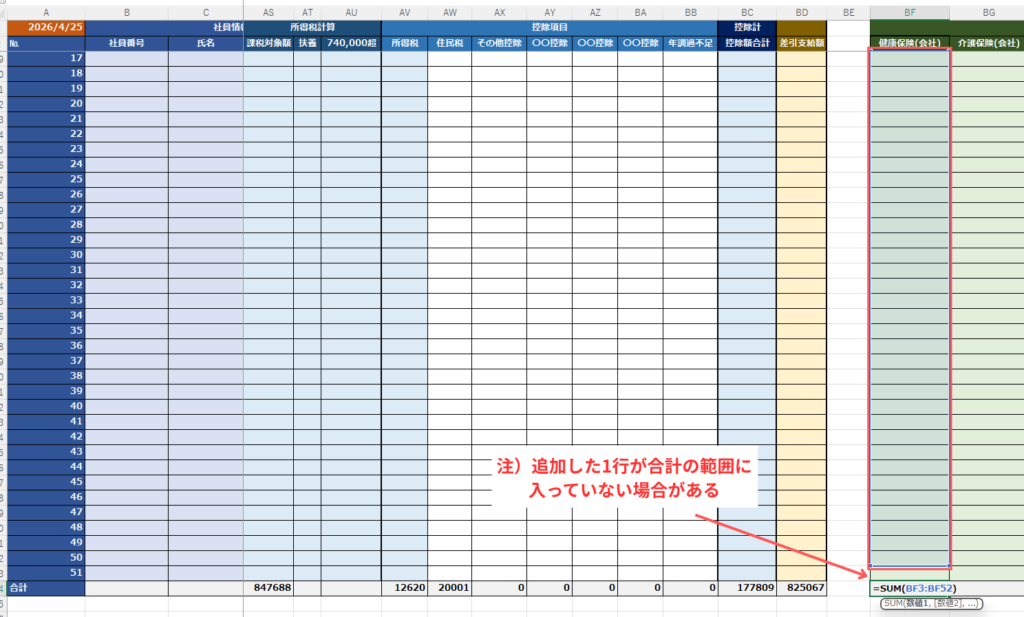 「給与計算」「賞与計算」シートの行数を増やした場合、合計(SUM関数)の範囲に増やした行が入っていない場合があります。