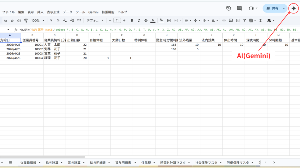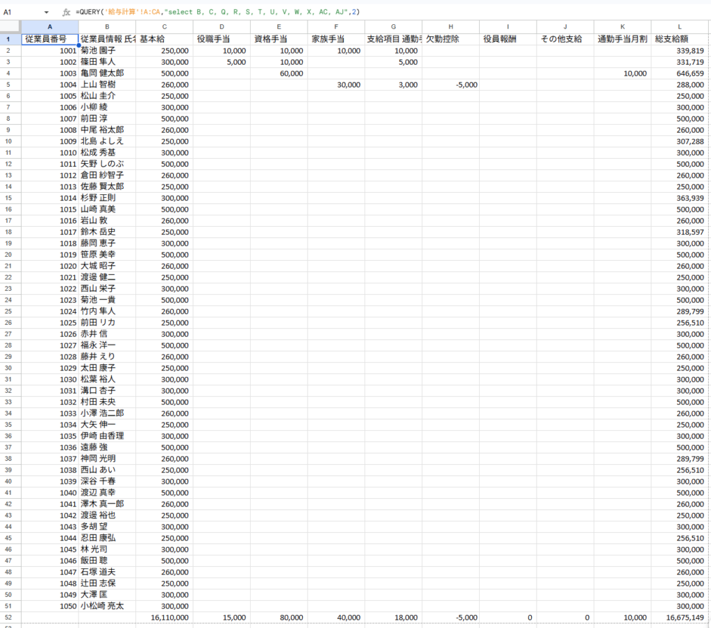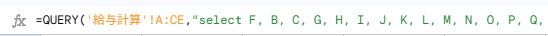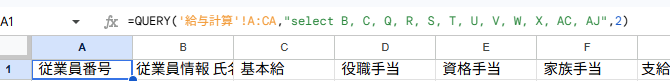 スプシ給与計算テンプレートの数式は[A1]セルのみに入っており、抽出したいシートや列(FやGなど)を指定することで、データを集約できるようになっています。