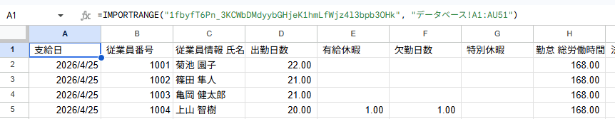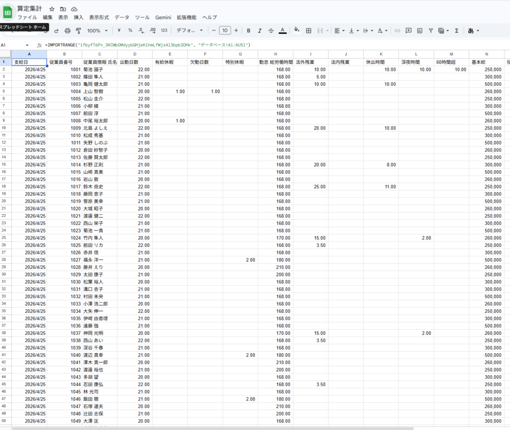 例えば、「【月給】2026年4月給与」「【月給】2026年5月給与」「【月給】2026年6月給与」という名前の3つスプレッドシートを「算定計算」というスプレッドシートに集約する場合は以下のようにデータを集約できます。