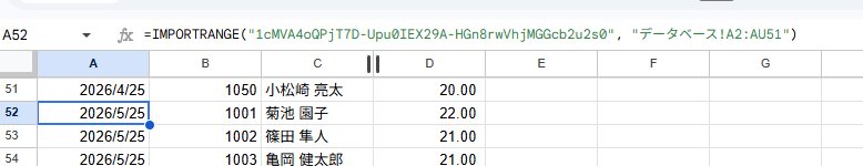 =IMPORTRANGE(スプレッドシートのURL, 範囲の文字列)