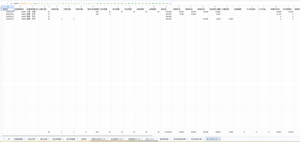 スプシ給与計算テンプレートでは、「データベース」タブが設けられています。