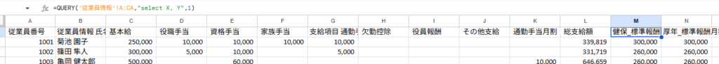また、「給与計算タブ」と「従業員情報タブ」を並べることで給与データと標準報酬月額の一覧表を作成することもできます。