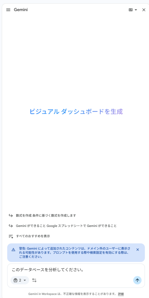 Geminiボタンを押下すると、下記のようなダッシュボード(サイドパネル)が開くのでそこに指示(プロンプト)を入力します。