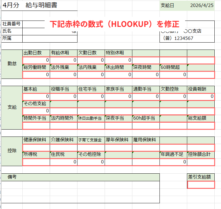 「給与明細書」「賞与明細書」はコピーするだけではなく、HLOOKUP関数の数式を少し修正する必要があります。