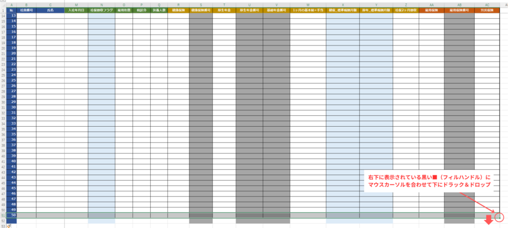 最終行の数式をコピーする必要があるため、下記の図のように最終行をすべて範囲指定し、右下に表示されている黒い四角(フィルハンドル)にマウスカーソルを合わせてドラッグ&ドロップします。
