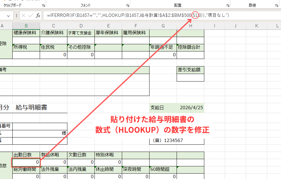 次に、貼り付けた給与明細書(賞与明細書)のHLOOKUP関数の数字を修正します。